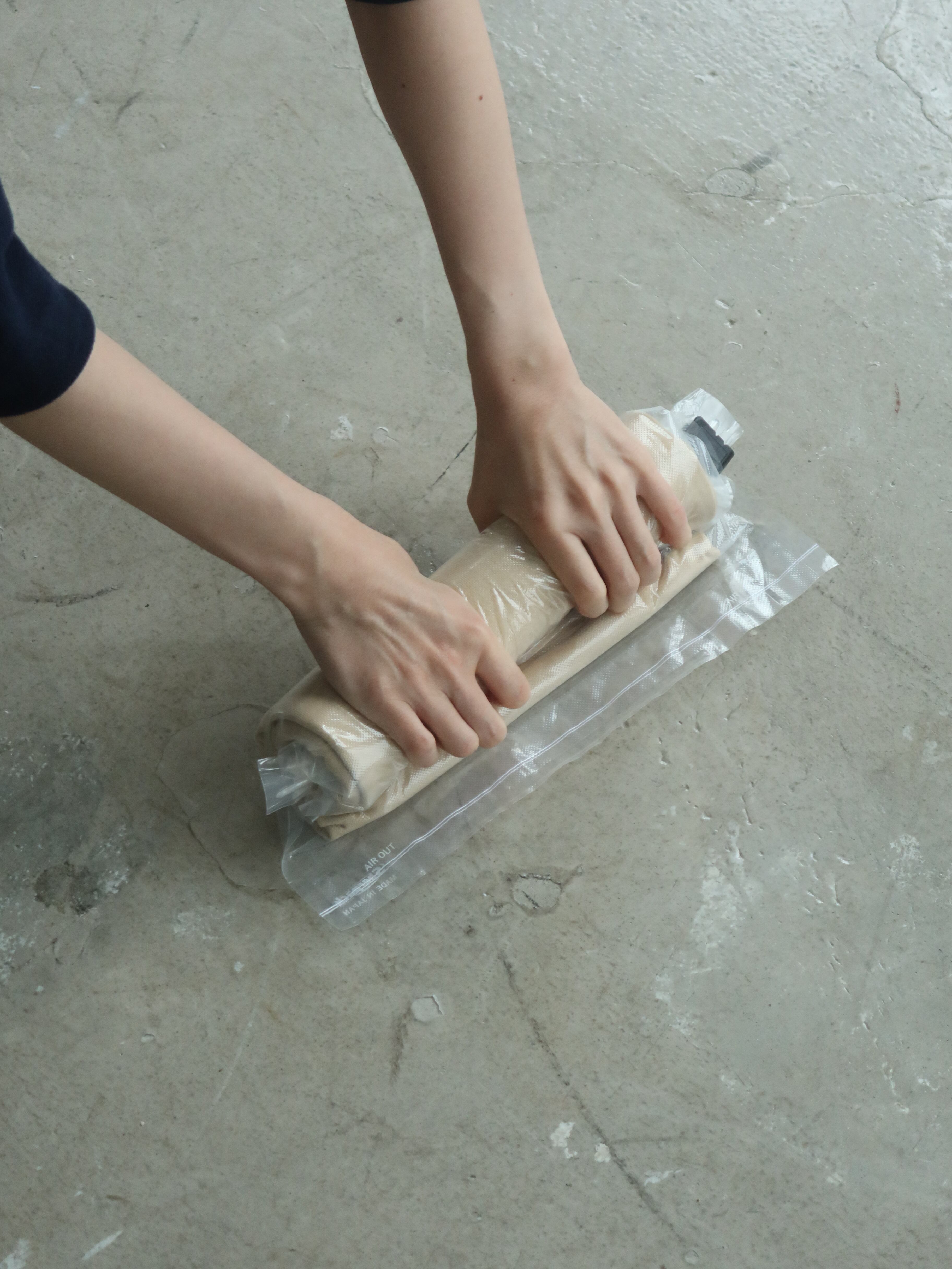 日本の放棄茶畑で採れる茶の実の殻を活用し、鉄媒染で染色しています。染上がりのほのかに甘い、茶の花を感じる香りを圧縮袋に閉じ込めました。購入した直後は、この香りをお愉しみください。