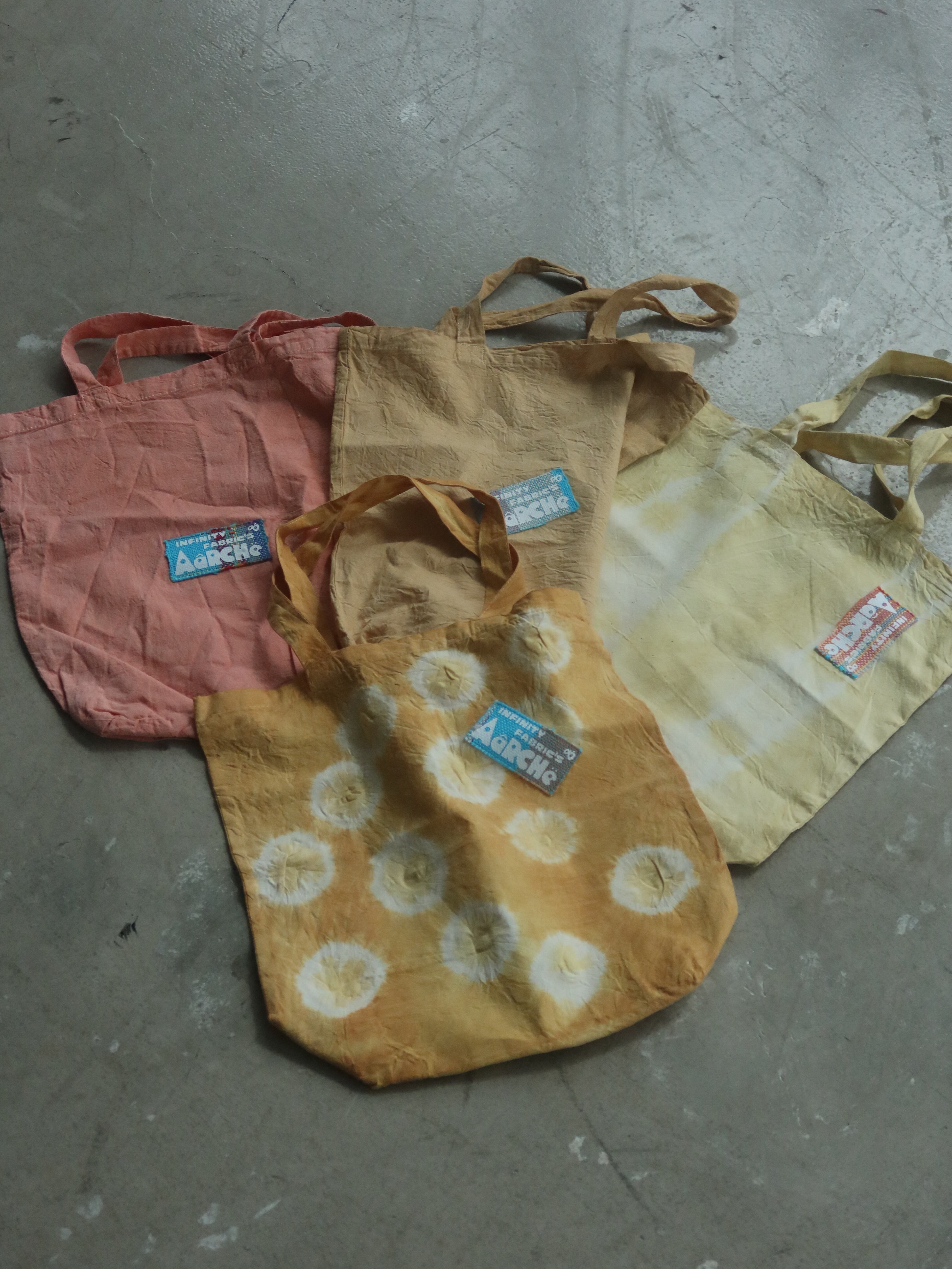 四条畷福祉会さんの庭で育った植物や野菜たちで、染色していただきました。色やデザインは季節や製作中の皆さまのテンションで決めていただいています。どんな色・デザインがくるかは届くまでのお愉しみ。