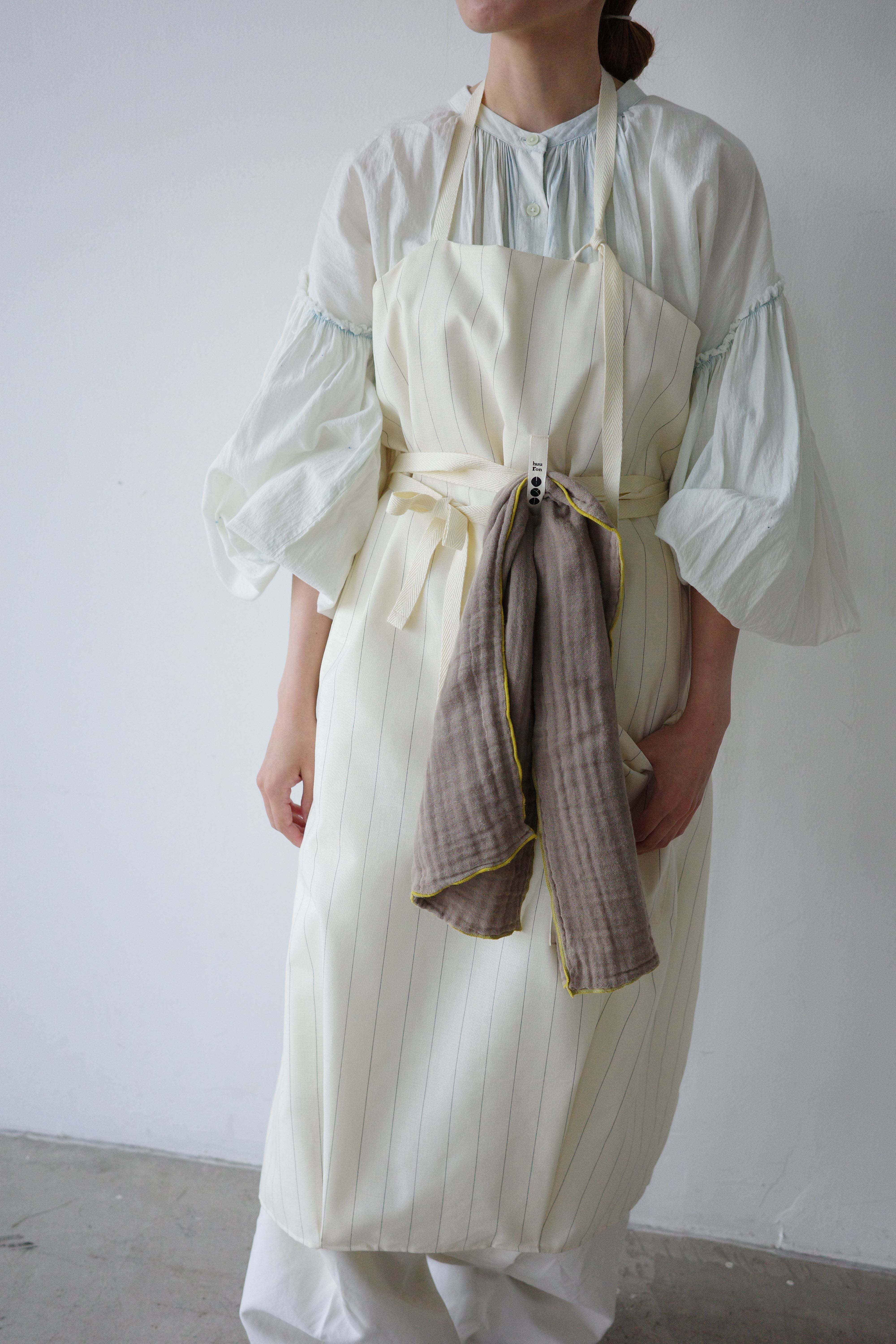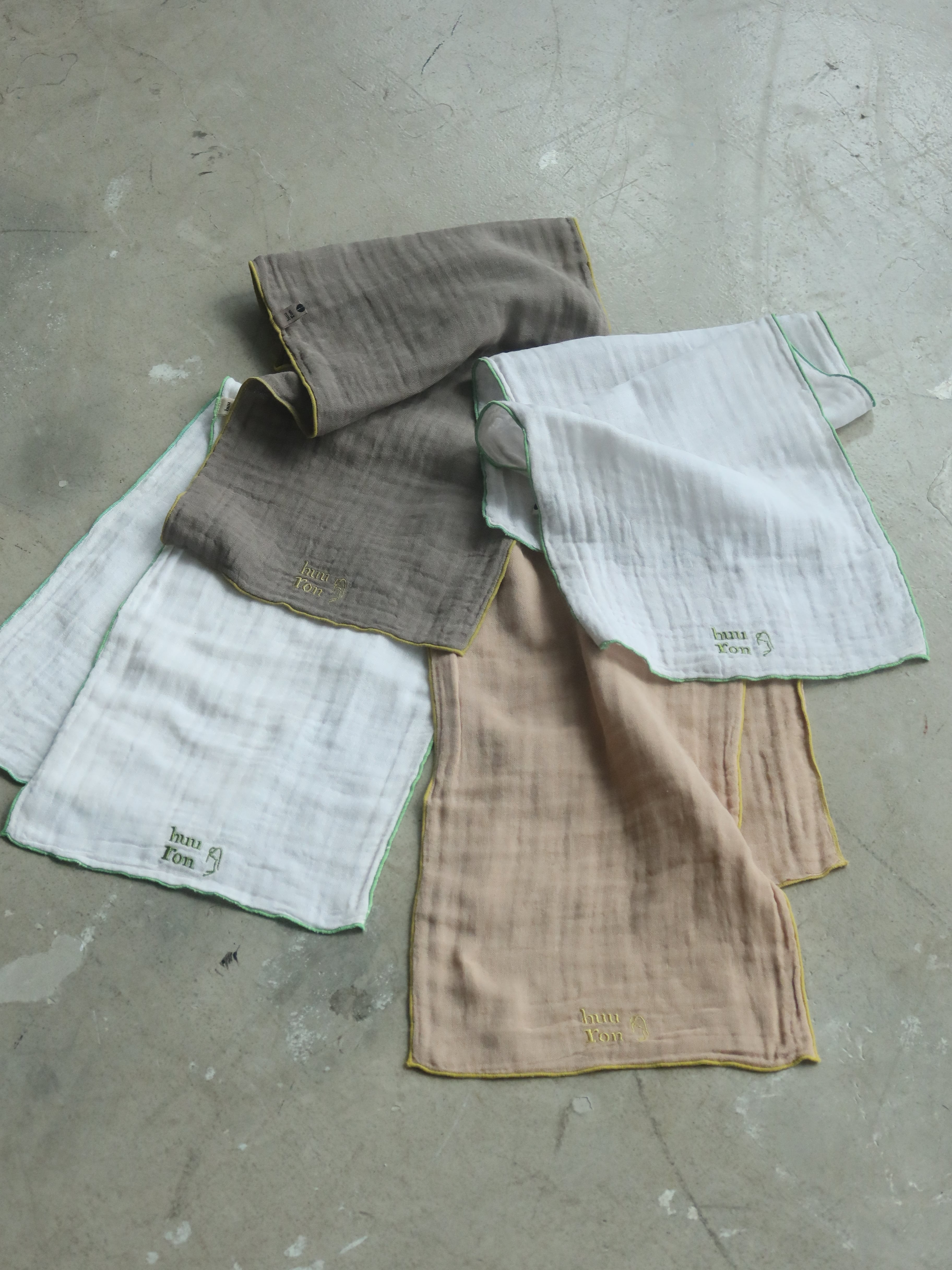 独自の茶の実染料で染色をしたキッチンクロスです。柔らかく薄手のガーゼを4重にし、色鮮やかな縁取りミシンとモチーフ刺繍を施した少し長めのクロス。エプロンの腰に垂らしたり、中央にあるネームをフックに通してご自由にお使いいただけます。 *茶の実は4色の色を表現することができました。是非お好きな色で愉しんでください~